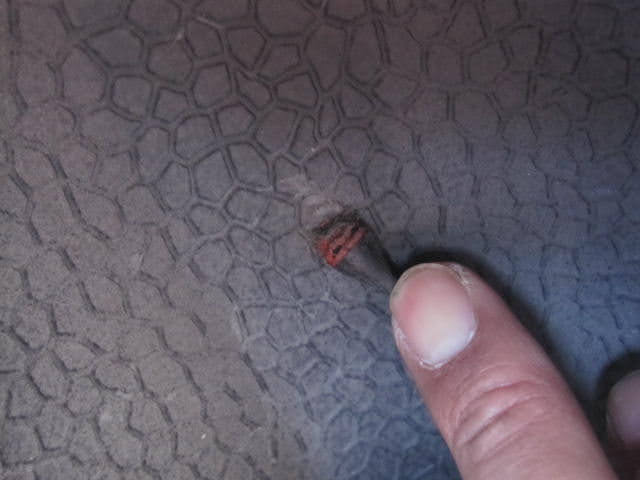 取り外したタイヤを裏側からみてみると、パンク修理の痕跡が2箇所。一つは前オーナーさんの時の痕でこちらはしっかりと補修されてました。