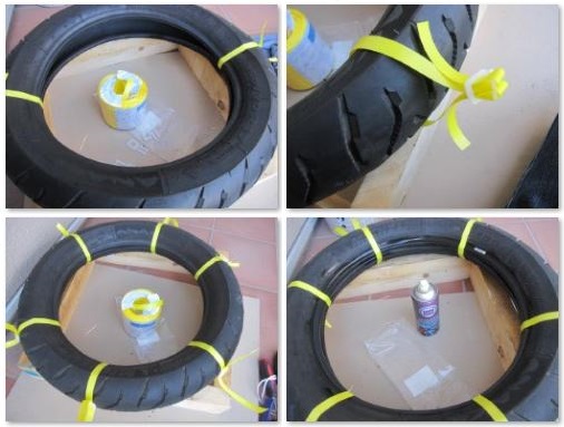 6箇所縛ったら、PPバンドとホイールが擦れる部分も含めて、両側のタイヤ端が合わさった部分に塗ります。スプレーで直接吹きかけると、必要ない部分にも飛ぶので、キッチンペーパーにスプレーを吹いてタイヤにヌリヌリするやり方がいいと思います。