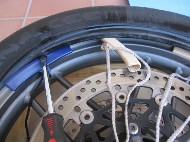 使い終えたリムプロテクターは紐を引っ張って中から取り出して再利用します。