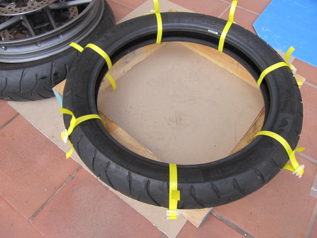お次はタイヤの裏表をひっくり返してディスクローター側を上にします。今回驚いたのが、ミシュランのアナキーⅢの特性なのか? TIGER800のキャストホイールが素晴らしいのか?