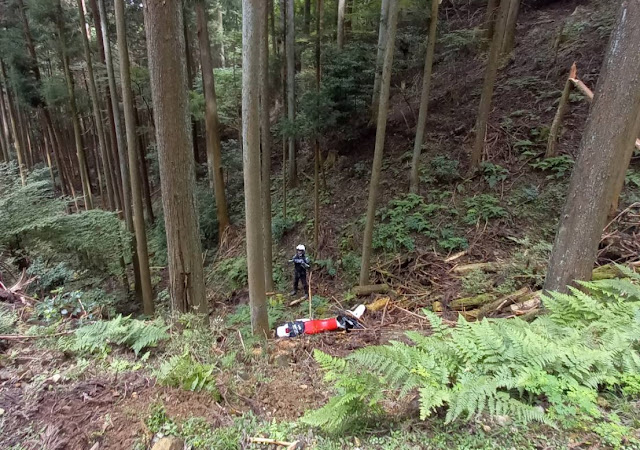 その後、バイクを立てて沢に沿って細い道を総勢4名で支えながら運搬したところ、林道に復帰でき無事にライダーとバイク共々元の林道に戻れました。